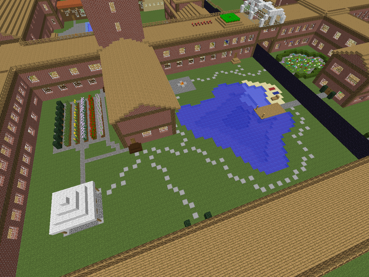 The house is about 402x183 blocks. Rooms include: the entryway, living room dining room, kitchen, pantry, game-room, library, rec-room, fireplace room, and tinkering workshop. (I challenge you to find them all).
